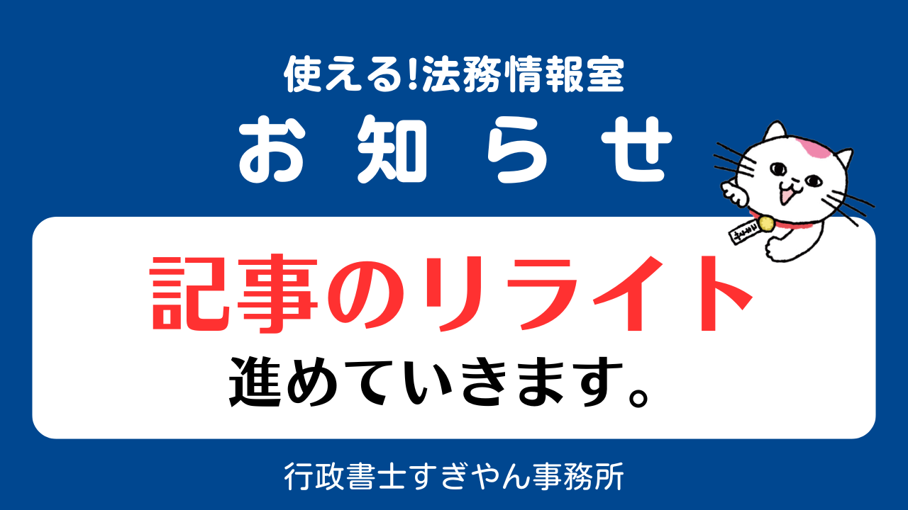 リライトに着手します お知らせ 2026.03.09 いつも「使える!法務情報室」をご愛読いただき有難うございます。 記事を書き始めて3年以上、記事数も150を超えました。この間の法改正の反映と読みやすさの向上を目的に、記事のリライト(アップデート)を進めることにしました。カテゴリー「契約書の基礎」から着手して順次進めていき、2026年4月末までには完了したいと思います。 引き続きよろしくお願いいたします。 行政書士すぎやん事務所 杉山元哉